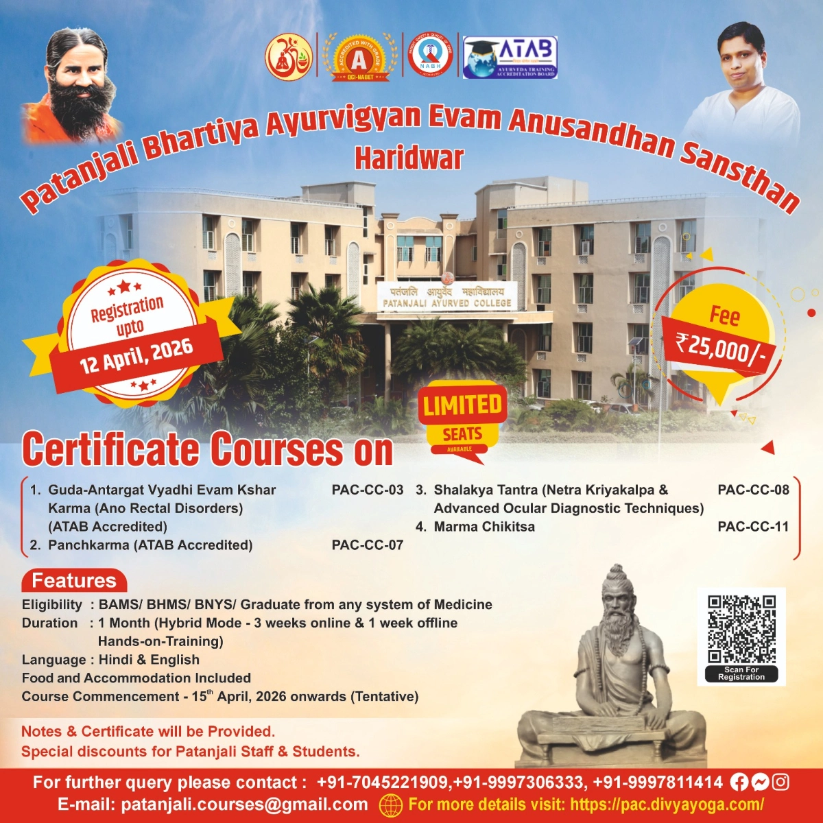 Established in the year 2009, Patanjali Ayurved College is directed to provide new dimensions to the teaching and research in Ayurveda. The institute is recognized by Uttarakhand Ayurved University, Dehradun & National Commission for Indian Systems of Medicine, New Delhi. The institute has the annual undergraduate intake, capacity of 100 B.A.M.S. students. And postgraduate courses being conducted in 11 departments with a total intake capacity of 77 postgraduate students, the college boasts, 14 state-of-the-art departments, fully equipped with labs museums, library, other concerned facilities and departmental OPDs.